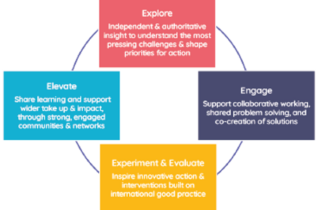 We build on well-established models of the policy-cycle and identified ‘qualities’ or ‘fundamentals’ of good policy-making in order to establish clearly defined pathways to impact. We seek to unlock cycles of continuous improvement in policy and practice through 4 Es: Explore, Engage, Experiment & Evaluate, and Elevate.